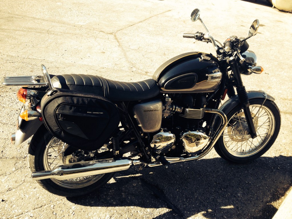 When you’re riding a cruiser, your body is tilted a bit back and the front wheel is well out front. It’s hard to be a nimble rider in that position. So, in spring of 2014, I bought a brand new Triumph Bonneville T-100 – a cafe racer styled bike! The Bonneville was a few ccs less than the Harley (865 cc versus 883 cc). Since I purchased it from a dealer, I could not test ride it. And, unlike when I bought my Harley, this time I actually knew how to ride a motorbike.
