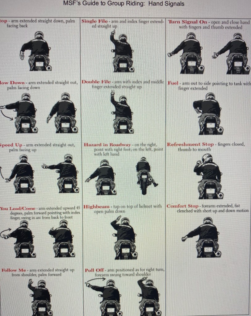 Communication between riders is truly critical to a successful group ride, particularly a multi-day ride. The MSF’s Guide to Group Riding provides a number of hand signals for group members to learn and use.
