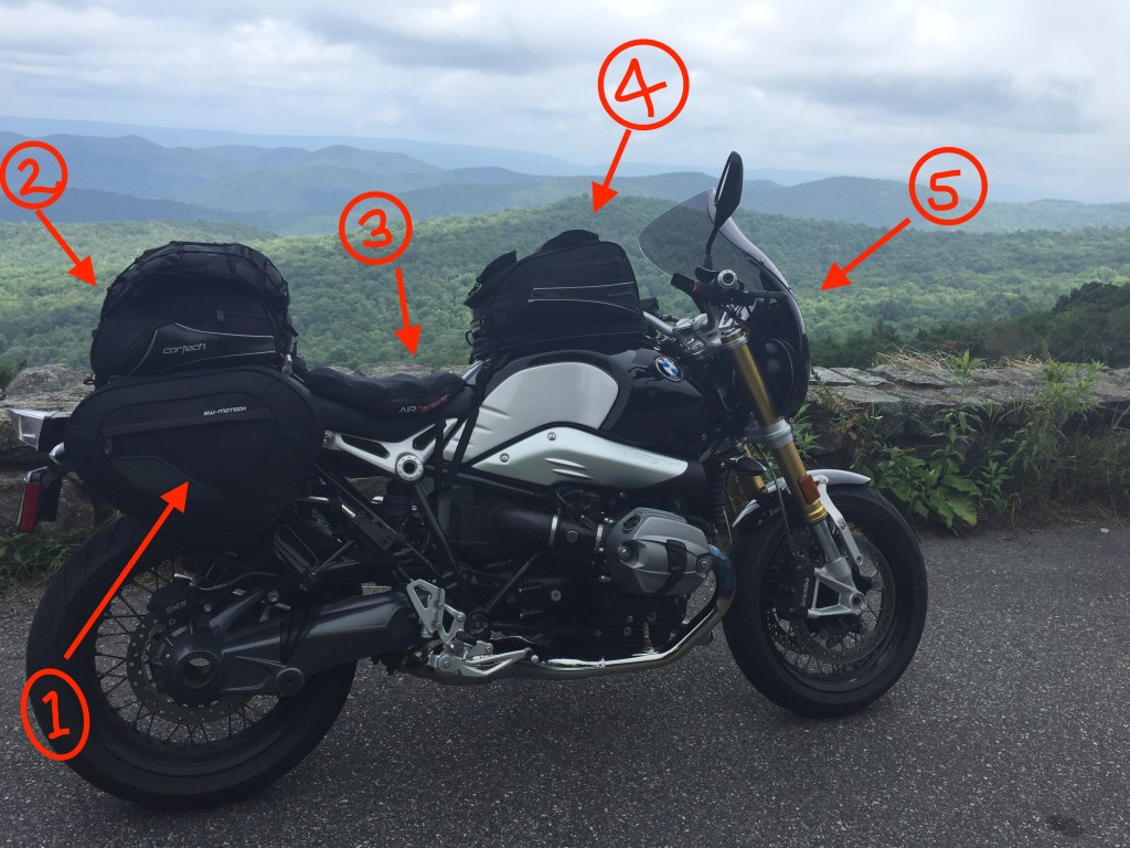 #1 – Saddlebags: I have SW-Motech Blaze saddlebags. They’re nylon so they’re light and they expand as needed. On long trips I use the waterproof interior bags that came with them. They are also low/no maintenance. They have bike-specific attachments, so I had to buy a new set when I switched from my Bonneville to my R nineT. I fit a lot in each saddlebag. The great thing about the interior bags is that at the end of a long day’s ride, I need only take the interior bag into the hotel with me.