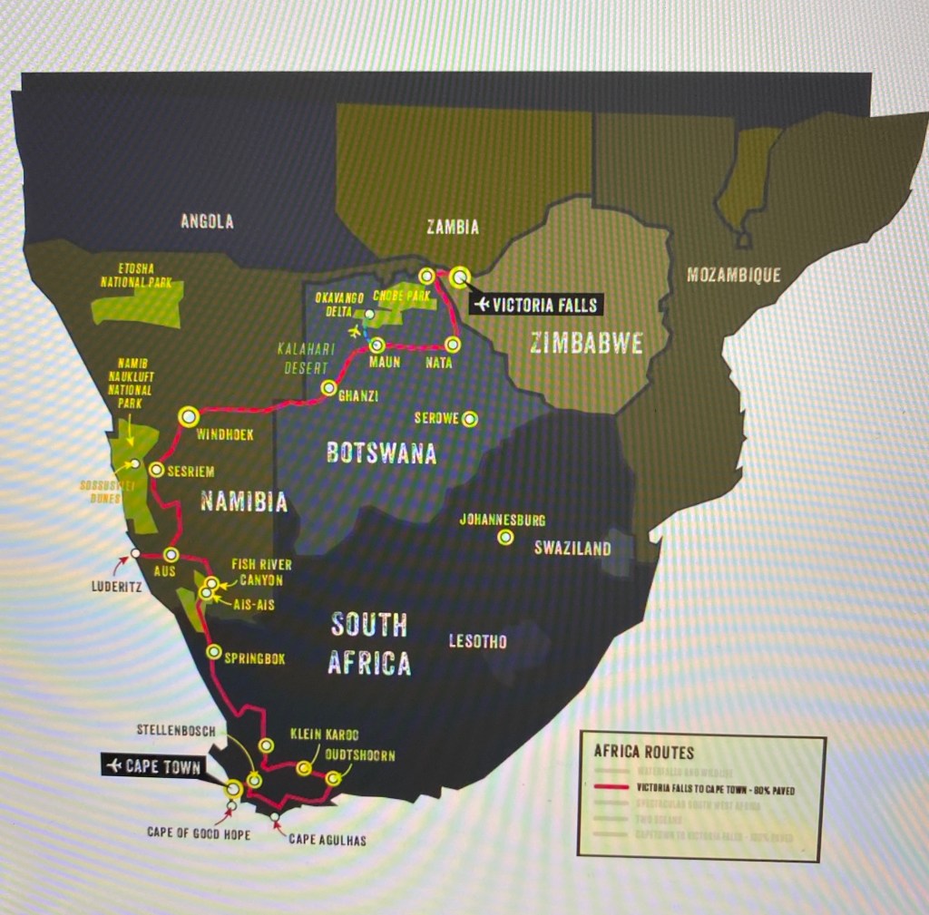 In early January 2017, I started giving Rene’s trips very serious thought. I decided on the trip I would want to take: the 5,000 km, three-week Victoria Falls to Cape Town Trip. It started in Zimbabwe, went through Botswana and Namibia and ended in South Africa. There were two big challenges though: the cost (approx. $15,000 plus flights and any extras) and the fact I’d be away from my partner for one-month. I was mulling these challenges over with my partner and ultimately she encouraged me to go. She may have wanted the month at home by herself but what she said was “we know you’re healthy this year and you can afford it right now. We don’t know if you’ll be able to do it next year. So, just do it!” She was right! I’d had a number of fit, former varsity athlete friends who had remained active and ate healthy diets, and yet, they were no longer with us. There are no guarantees in life. So, I decided to do it and contacted Rene on January 11, 2017 to sign-up for the Victoria Falls to Cape Town Trip starting on September 25, 2017.