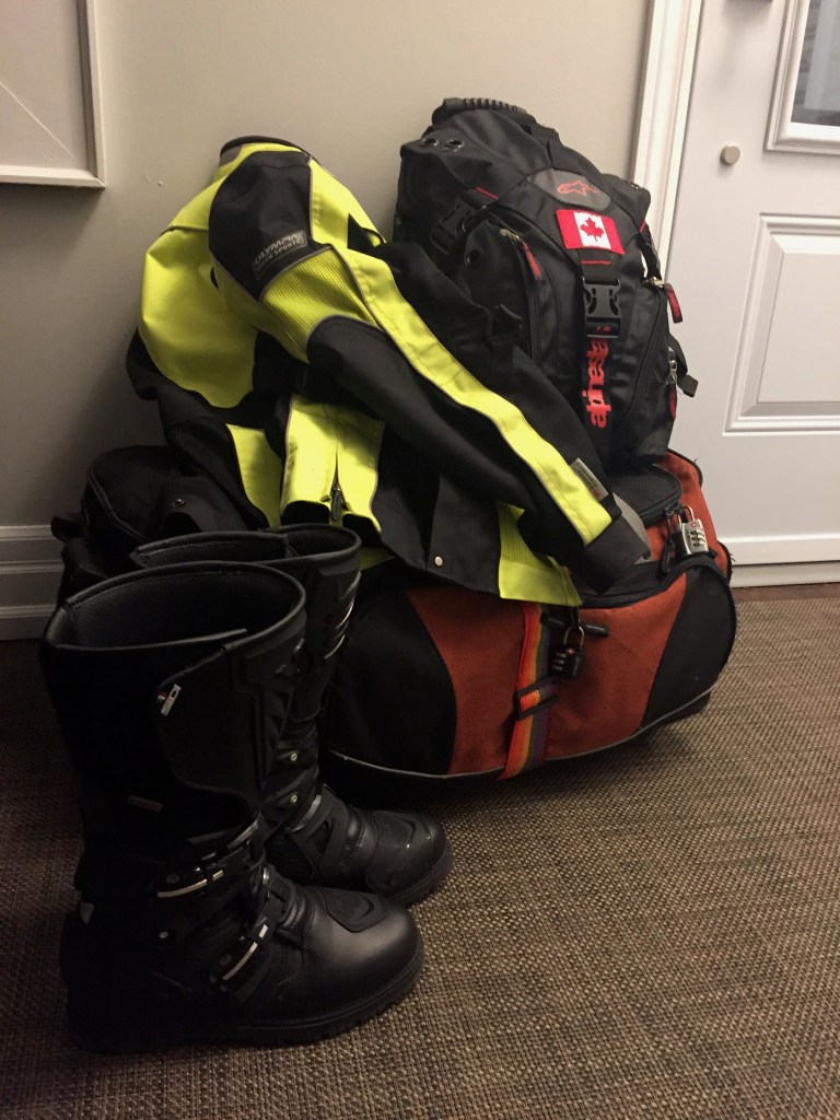 DAY 1 of my trip was September 23, 2017 when I left Toronto. In preparation for my trip I packed as lightly as I could (unfortunately, one item I decided to leave at home I would regret daily for almost a week – more on that poor decision in a future blog). Although most of my belongings were in one large bag, I had numerous “packing cubes” within the large bag so my items were compartmentalized for easy access. Also, I made sure that, in the event that large bag was lost, everything I needed to start the motorcycle trip I either wore or had as carry-on. So, I wore my boots and my motorcycle jacket on the flight. My helmet was in a carry-on backpack as was my cooling vest and gloves. I was ready to hit the road with Renedian with or without my luggage.